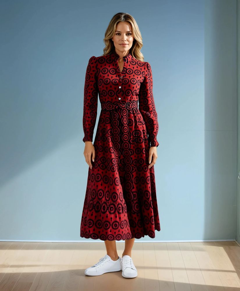 A gorgeous, slim-fitting style with pretty smocking detail at the cuffs and at the back to flatter the waist. This elegant dress falls to mid-calf length with sleeves that cover the elbow.